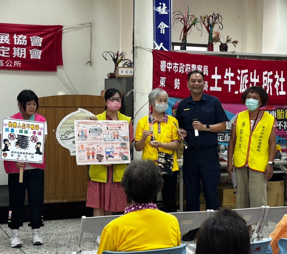 【記者吳世詮/台中報導】臺中市石岡區萬興社區發展協會長壽俱樂部於5日於萬興宮辦理「高齡者關懷據點」,東勢分局土牛派出所所長吳清煬攜員前往進行護老交通安全宣導活動,接地氣與高齡者們「互相博感情」促進警民良好關係,警方藉由活動宣導正確觀念,確保長者們外出行的安全,平安返家。