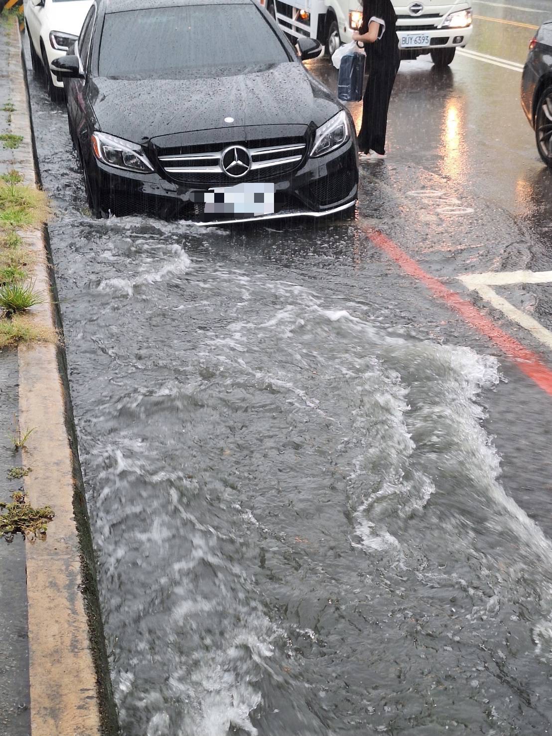 北區太平國小(北區太平路74號)正門口,大雨淹水造成水溝蓋如噴泉