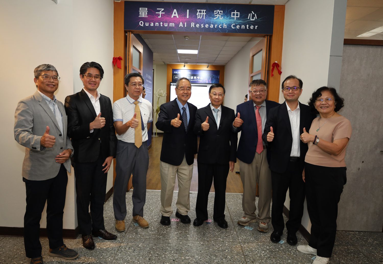 亞大量子AI研究中心揭幕,亞大校長蔡進發(右4)、量子AI研究中心榮譽主任王康隆(右5)、量子AI研究中心主任黃光彩(右3)等合影。