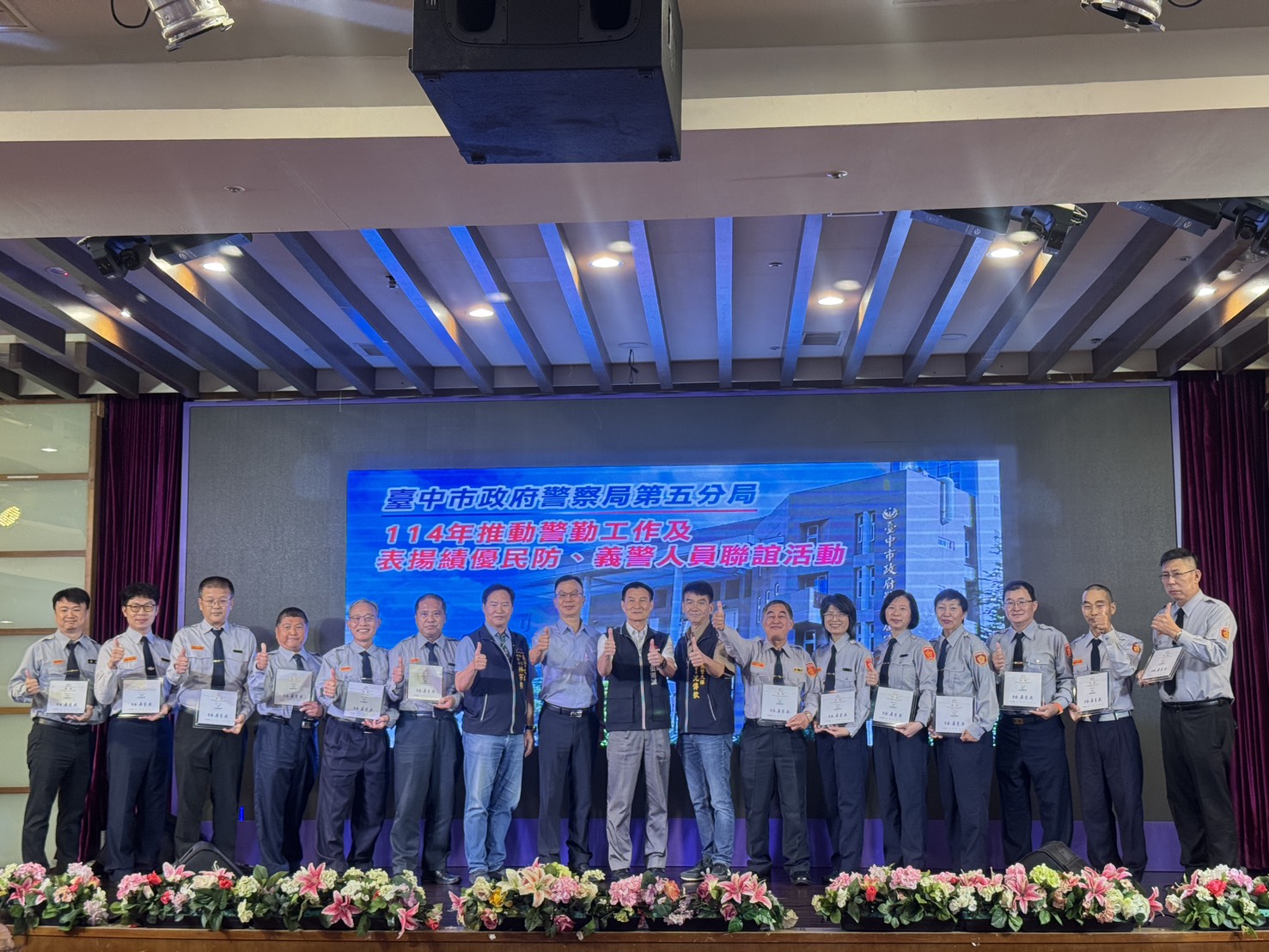 【記者鄧力軍/台中報導】臺中市政府警察局第五分局昨(23)日在北屯區大和屋日本國際美食館隆重舉辦「114年度表揚績優民防、義警聯誼活動大會」,會中邀請北屯區各級民意代表、仕紳、民防、義警大隊及警察局近500人歡聚一堂,現場氣氛熱烈,受獎人員中有13位投入義勇民力工作長達20年之久,獲頒內政部長獎,由市警局督察長張則誠代表市長頒獎,另有25名民防、義警兄弟姐妹獲頒市長獎。