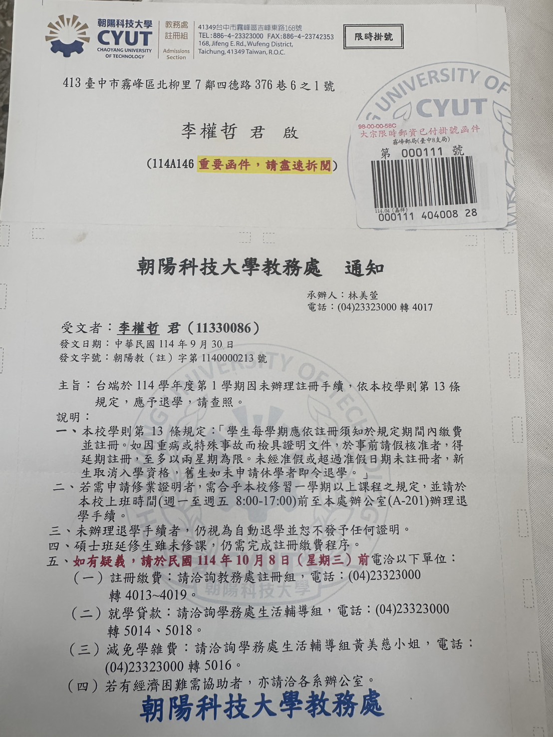 事後學校於9月30日發公文給李同學說明,該員於114年度第1學期因未辦理註冊手續,依該校學則第13條規定,應予退學,同時註明「若有經濟困難協助者,亦請洽請各系辦公室」。不過陳錫源指控,公文發文日期可以任意填寫,命案發生後,學校知道問題嚴重,才發文彌補掩飾,並強調經濟困難可以申請協助。