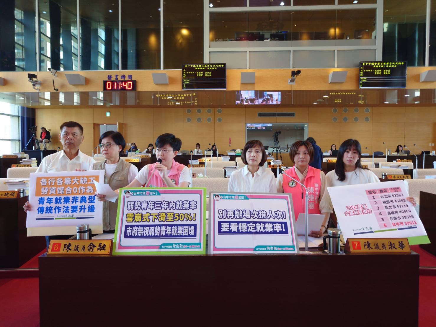 【記者蘇詩鋒/台中報導】台中市議會今日(14日)舉行民政業務質詢,市議員陳俞融、陳淑華、蕭隆澤、張芬郁、陳雅惠、謝家宜等人提出台中市政府對弱勢青少年的就業輔導機制正瀕臨崩潰,要求市府拿出有效對策,不能持續無視弱勢青年困境。