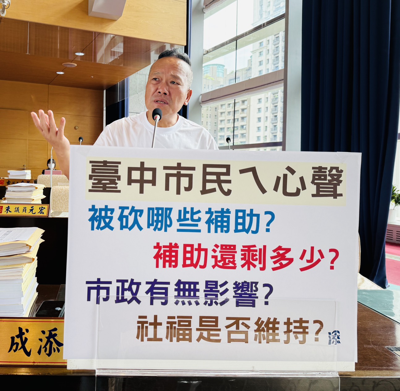 【記者蘇詩鋒/台中報導】中央近期有如皇帝宣旨般大砍地方補助款,造成地方財政紊亂,連臺中市也不例外,市議員陳成添於議會質詢問出市民心聲:臺中市究竟被砍多少預算、到底錢還剩多少?