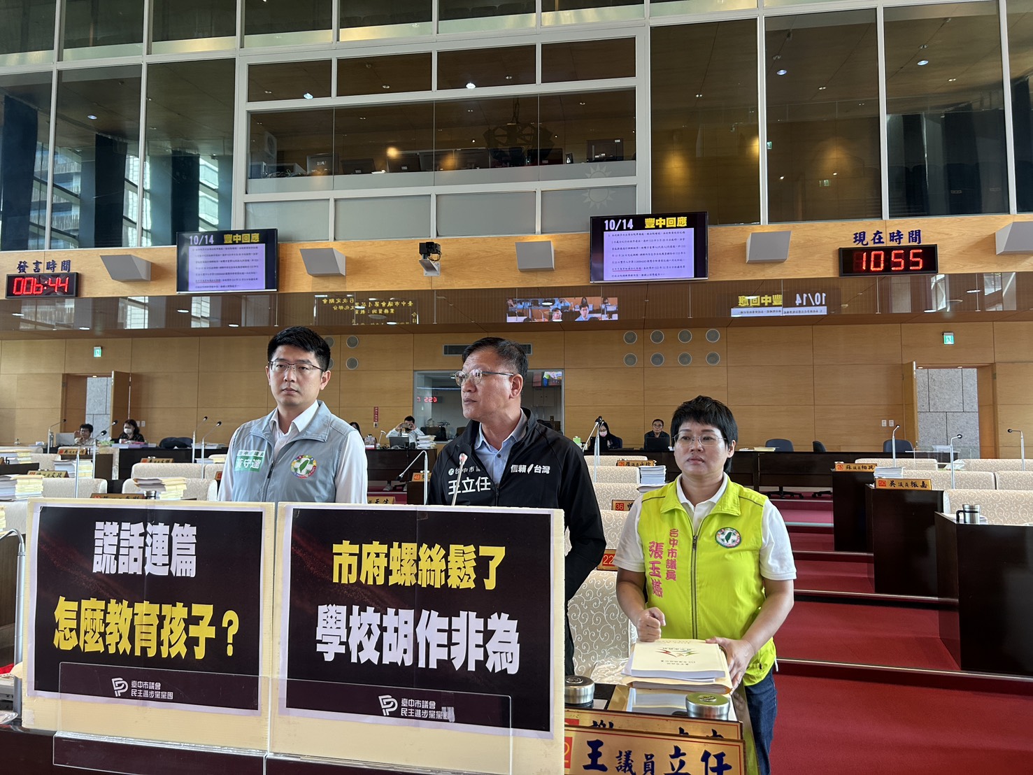 【記者蘇詩鋒/台中報導】臺中市議會今(21)日教育文化業務質詢中,民進黨籍市議員王立任、黃守達、張玉嬿及謝志忠再度追問教育局豐原高中撤銷處分案。從10月14日於記者會中揭露校安人員撤銷記過以來,教育局與校方的說法前後不一,校方甚至被查出對外聲稱的「不再另行懲處」與調解筆錄內容不符,而被揭穿後,如今又改口稱依契約「永不再錄用」,整起事件不僅未遵守行政程序,更暴露出教育局監督失靈、校方謊話連篇的問題。