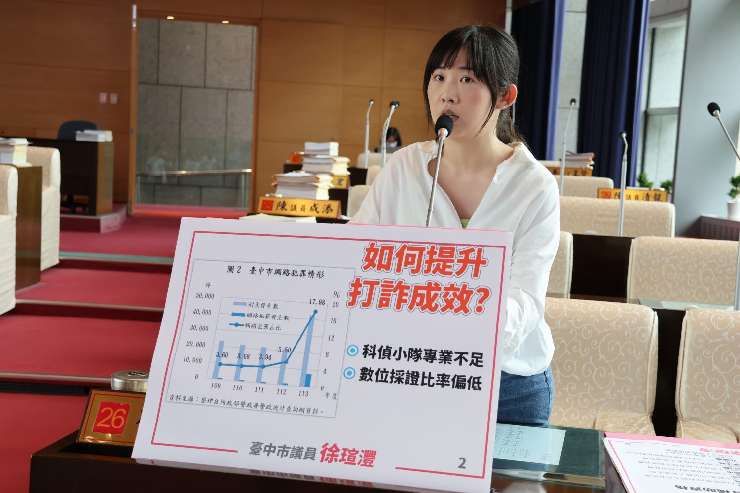 面對犯罪型態快速變化,徐瑄灃引述刑事案件及網路詐騙數據,指出台中市網路犯罪案件大幅上升。徐瑄灃強調,市警局應持續提升科技偵查專業訓練及人才培育,提升分局科技偵查戰力。徐瑄灃更提醒警察同仁在維護治安,打詐辦案的同時,除了提升科技犯罪偵查專業能力,也要注意維護市民個資及隱私權。