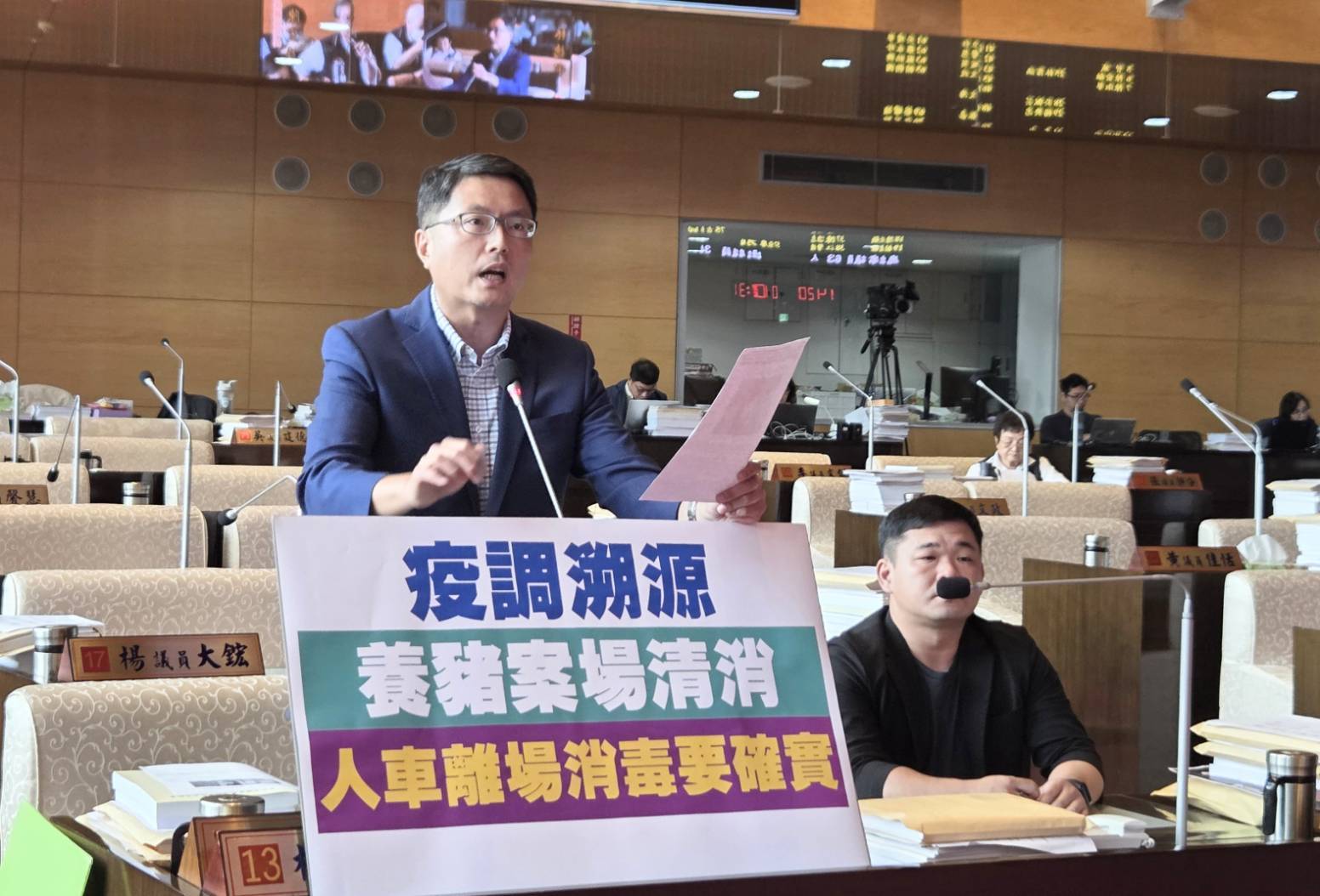 【記者蘇詩鋒/台中報導】針對非洲豬瘟疫調過程及案場清消,市議員林德宇今(10/31)在議會警消衛環業務質詢時表示,養豬案場因清消不確實,至今仍檢出2處病毒核酸陽性反應,他要求環保局要確保前2次有進入養豬案場的清消人員,後續的消毒及管制有落實,而提供豬場廚餘的梧棲清潔隊,案發前的家用廚餘收運路線應完整揭露,並提供更具警示性及可被追查的潛在風險處所,讓疫調溯源能更明確。