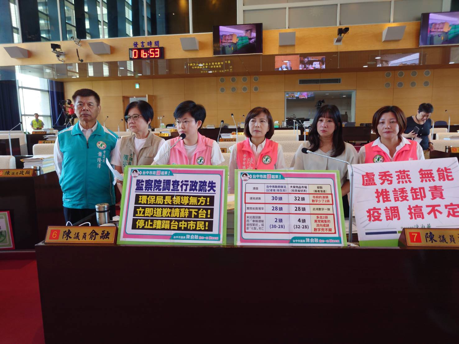 最後,陳俞融強調,台中市爆發非洲豬瘟,市府團隊防疫慢半拍、荒腔走板,從農業局一開始未強制採樣,到環保局的稽查制度完全失靈,讓台中市成為全國防疫的破口, 這十天來,市府的說法反覆修改、漏洞百出,已經讓市民的信任徹底崩盤。民進黨團今天已經北上到監察院,告發市府團隊嚴重的行政疏失,追究到底!