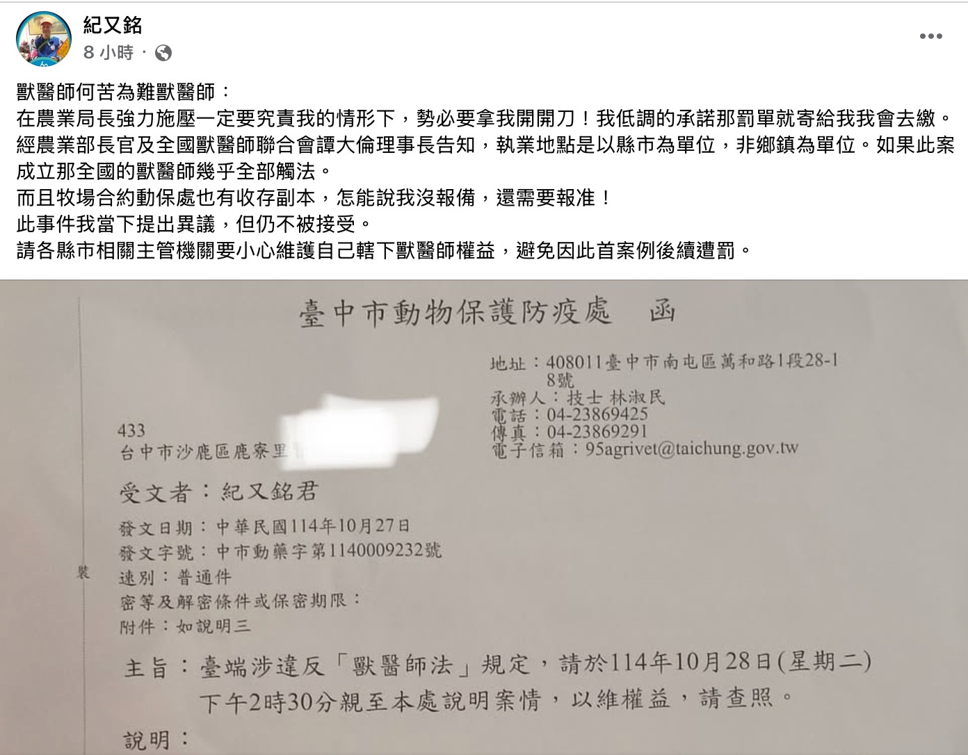 周永鴻接著指出,紀姓獸醫31日再發文,指盧市府竟引用《獸醫師法》第七條指控他和養豬場合作,因為跨行政區且未經報備執業而違法。但該條本是規範「跨縣市」,不是「跨區」。若硬拗成立,全國獸醫都可能違法。