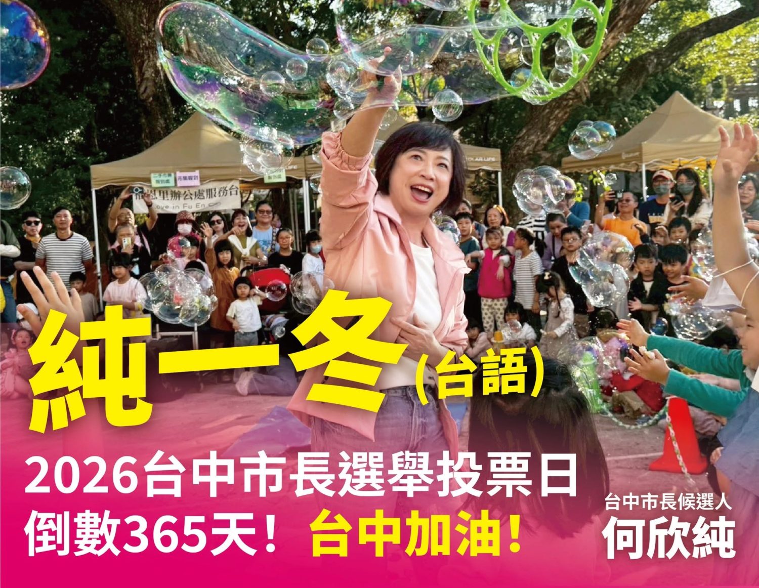 今天,距離明年1128台中市長投票日「純一冬」,何欣純服務台中的心願更堅定,更充滿信心、也有決心,請一起為何欣純加油!