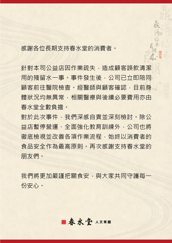春水堂表示,將全額負擔所有醫療費用並持續追蹤顧客狀況。公益店於今日11時30分起暫停營業兩天,全台門市也同步加強流程檢討與標示提醒,以防類似「離譜烏龍」重演。