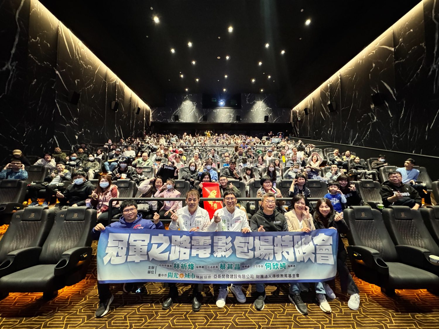 【記者蘇詩鋒/台中報導】中華隊勇奪世界12強賽冠軍紀錄片《冠軍之路》上映兩週,票房已突破4,600萬元,熱潮持續延燒。台中市議員林祈烽、臺中市陽光城市發展協會理事長李文烈偕同企業友人,與中華職業棒球大聯盟會長蔡其昌、立法委員何欣純共同包場支持國片,消息公布後,短短三天內即湧入超過2,000人報名,林祈烽隨即緊急加開兩場,以提高民眾中籤機率。昨(17)日晚間連續舉辦兩個場次,第三場次則因影廳滿場調整至1月19日舉行,三場合計提供近700位民眾進場觀影,一同見證這群台灣英雄從不被看好,一路拚搏到站上世界冠軍的感動歷程。放映前後,蔡其昌與教育部政務次長張廖萬堅也到場分享心路歷程,與觀眾交流冠軍背後的故事。
