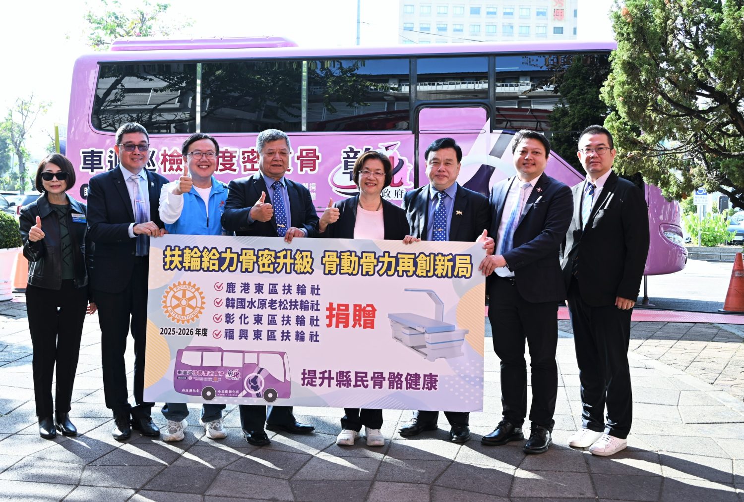 【記者吳晟明/彰化報導】彰化縣政府於今(28)日在衛生局舉辦「扶輪給力骨密升級,骨動骨力再創新局」扶輪社捐贈骨質密度檢測儀記者會,由縣長王惠美代表接受捐贈。此次活動展現本縣自108年推動骨質密度社區巡迴篩檢以來的豐碩成果,感謝國際扶輪社3462地區、鹿港東區扶輪社長謝一清、彰化東區扶輪社長劉燦霖、福興東區扶輪社長陳鼎中以及韓國水原老松扶輪社,與以上全體社員,共同捐贈全球獎助金7萬美元(超過新台幣210萬元),全力支持本縣推動骨質密度社區巡迴篩檢服務,攜手守護縣民骨骼健康。