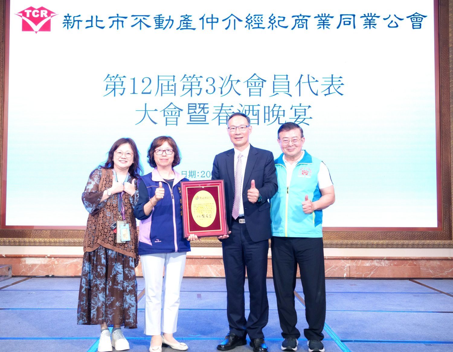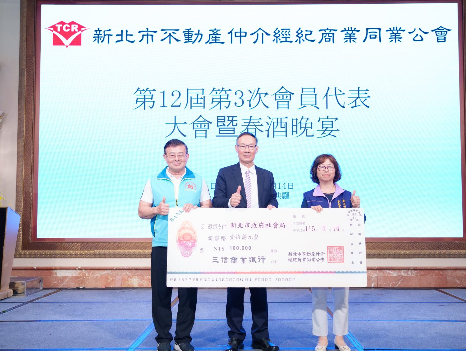 【記者邵祥輝/新北報導】新北市不動產仲介經紀商業同業公會響應新北市好日子愛心大平台,日前新莊典華餐廳召開第12屆第3次會員代表大會時理事長林平川代表捐該公會捐贈10萬元,做為新北市家外安置兒少支持服務計畫,社會局副局長許秀能代表受贈,並回贈侯友宜市長的感謝牌,地政局長汪禮國和經發局長盛筱蓉亦到場致意。