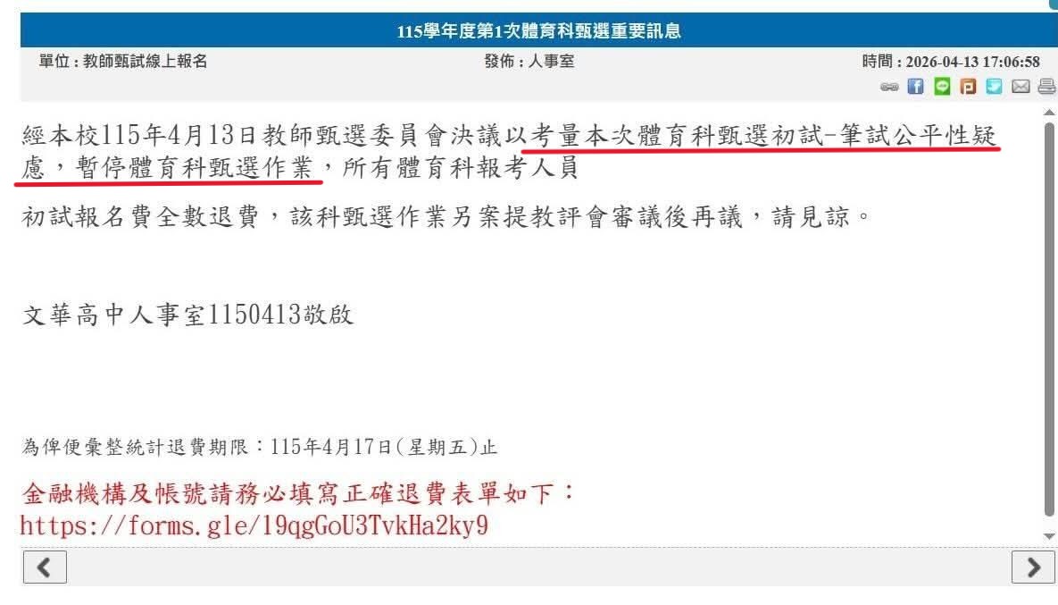 【記者蘇詩鋒/台中報導】全台各級學校正舉辦教師甄試,台中市文華高中辦理體育科教甄初試後,竟以「筆試公平性疑慮」取消考試並退費,讓考生和家長炸鍋,市議員張芬郁質詢指出,教育局應調查真相向外界說明,也質疑教甄獨招易流於黑箱作業,教育局應督促高中職加入全國聯招。 台中市議會17日進行教育文化委員會業務質詢,市議員張芬郁、陳雅惠、謝家宜、陳俞融、陳淑華、蕭隆澤等人聯合質詢,關切目前各級學校正舉辦的教師甄試作業。 市議員張芬郁表示,國中小教師甄試採聯招辦理,高中職則獨招、全國聯招並行,文華高中在4月10日獨招辦理數學、物理、化學、生物和體育科教甄初試,體育科1名缺額,有36人報考,白天體能科考試、晚上筆試,4月13日,校方卻公告「考量本次體育科甄選初試─筆試公平性疑慮,暫停體育科甄選作業,所有體育科報考人員初試報名費全數退費」。