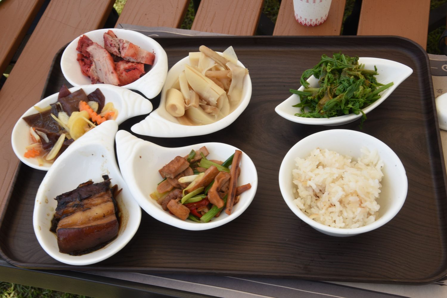 宴席菜單則融合經典與創新,精選苗栗當季食材入菜,規劃3段式上菜,共呈現10道料理。前菜「客庄的開始」以滷味、醃菜與冬瓜封搭配老菜脯雞湯,展現質樸純粹的客庄風味;主菜「炆火與鍋氣」除梅干扣肉、客家小炒等經典料理,另透過炆、炒、涼拌等多元手法,將紅棗、桂竹筍、過貓、紅糟與桔醬等在地食材巧妙融入,呈現層次豐富的客家好味緒;甜品「收尾與記憶」,則以桔餅甜米糕搭配苗栗當季水果,為宴席畫下溫潤圓滿的句點;場邊還設置茶席與奉茶區,提供銅鑼生產的東方美人茶與苗栗紅茶,讓飲食與茶香相互交織。
