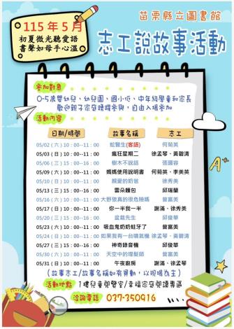 115年5月志工說故事活動地點於圖書館1樓兒童閱覽區,誠摯邀請親子一同參與,在故事的陪伴中度過溫馨愉快的閱讀時光。詳細活動資訊請參閱活動海報,或洽詢苗栗縣立圖書館(電話:037-350916),亦可至苗栗縣政府及苗栗縣立圖書館官方網站查詢更多訊息。