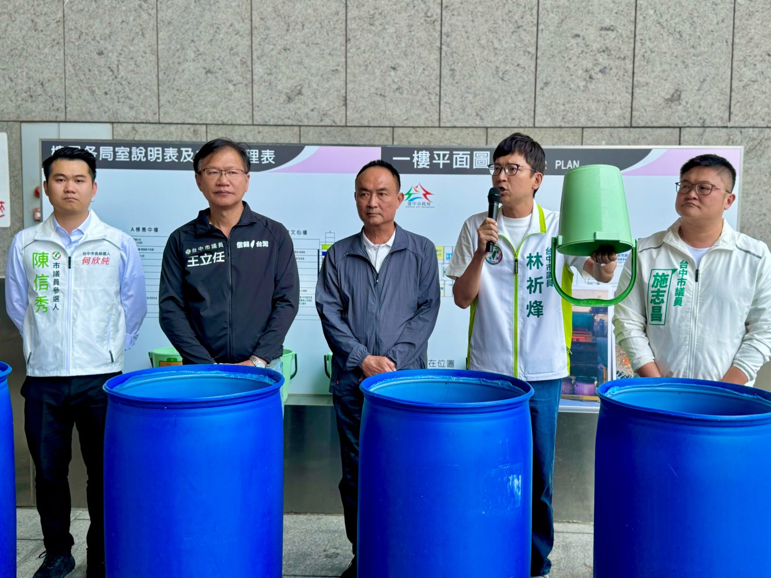 【記者蘇詩鋒/台中報導】日前有網友在社群平台揭露,台中市北屯區清潔隊員將垃圾汙水及廚餘餿水排入路邊水溝,引發爭議。台中市議員林祈烽、施志昌、王立任及北屯區議員候選人陳信秀,今日攜帶各式廚餘桶至市府前召開記者會,痛批此舉不僅造成環境污染與惡臭,更凸顯市府長期在垃圾與廚餘去化上失能。議員們要求市長盧秀燕應儘速查明真相,並全面檢討廚餘垃圾汙水處理的SOP及去化量能,提出具體改善對策,避免類似亂象一再發生。