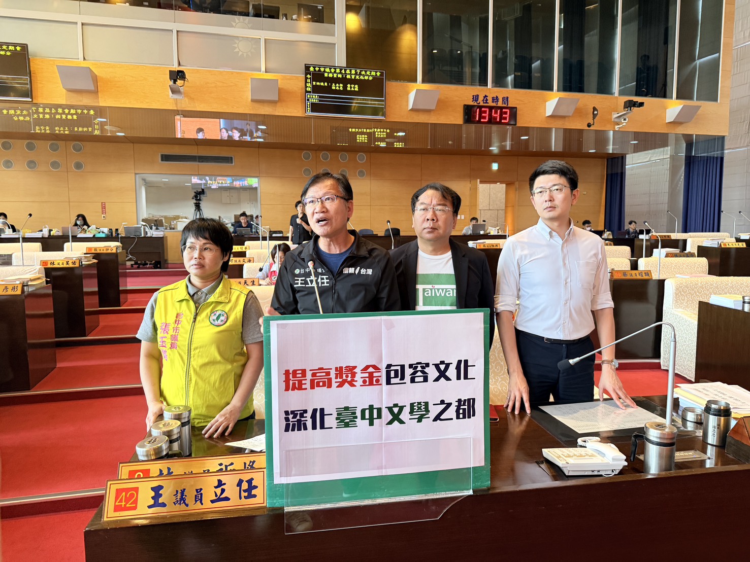 【記者蘇詩鋒/台中報導】臺中市議會今(21)日教育文化業務質詢中,台中市議員王立任、謝志忠、張玉嬿、黃守達共同指出,臺中文學獎作為臺中在地文學界人才搖籃,文化局與市府團隊應付出更多心力顧及,建議透過升級獎勵制度與類別等,持續強化文學獎的深度與廣度。