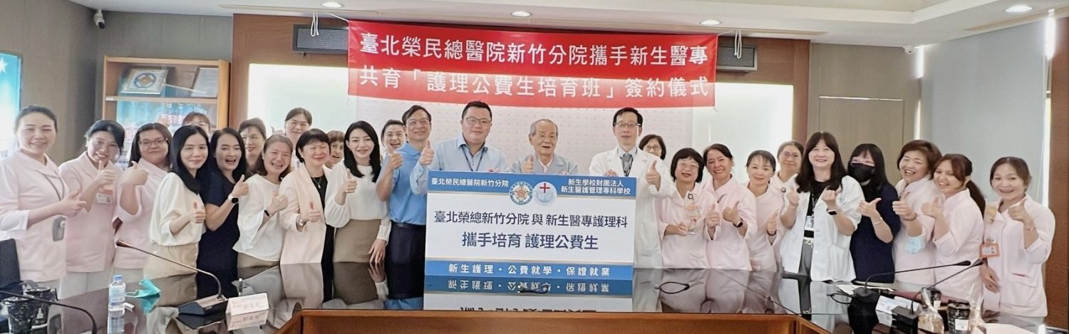 臺北榮民總醫院新竹分院正式與財團法人新生醫護管理專科學校簽署「攜手培育護理公費生」計畫。雙方透過產學深度結盟,提供公費生每人每年12萬元獎助學金,旨在緩解偏鄉護理人力缺口,深耕在地人才培育,翻轉職場環境,達成「入學即就業,畢業即留用」的共榮目標。