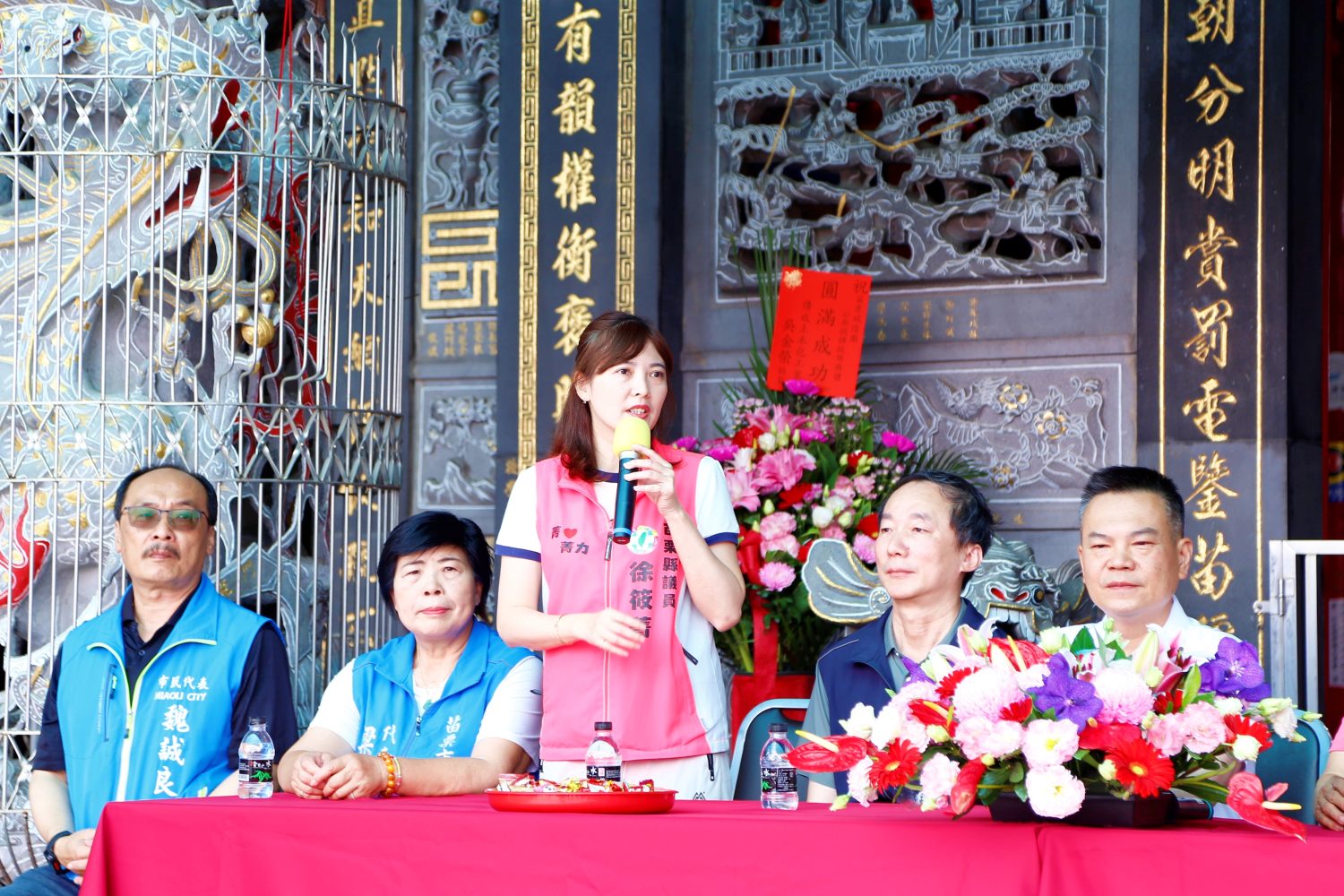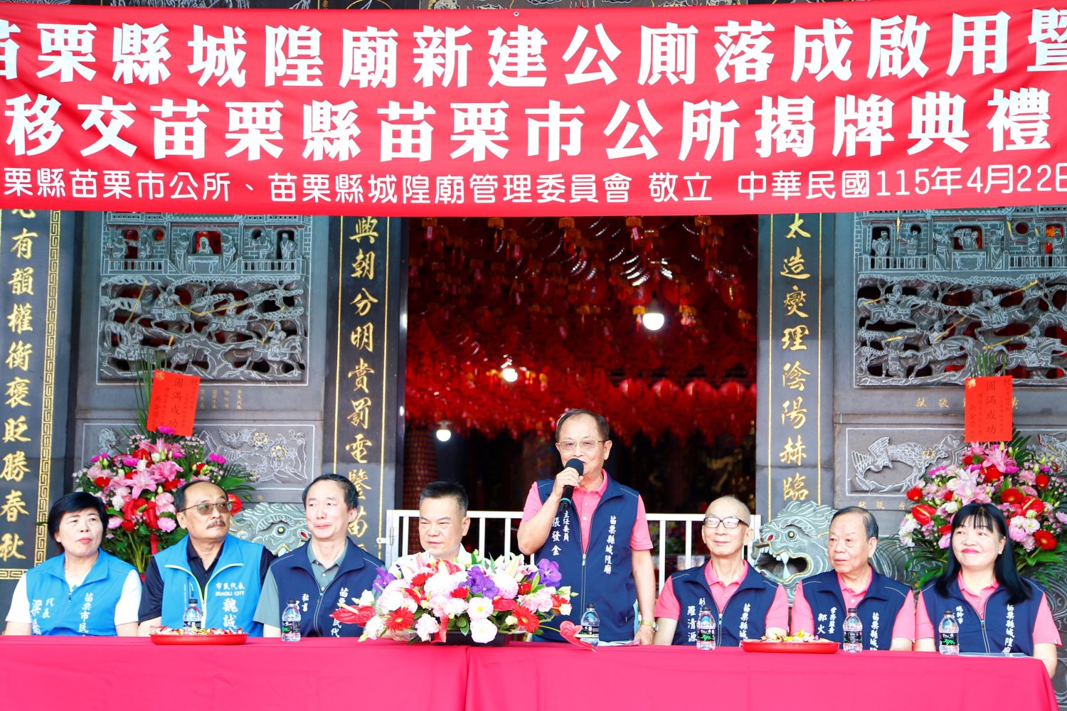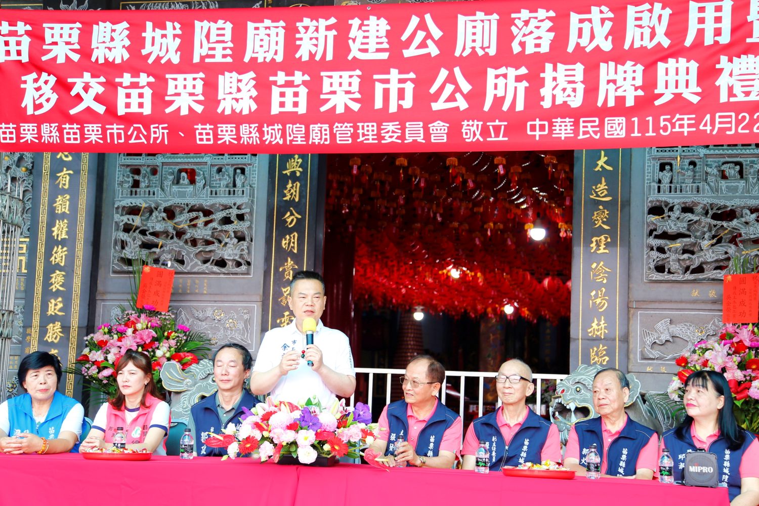 本次揭牌儀式由城隍廟管理委員會主任委員張發金、副主任委員羅清源、常務監察郭火金、總幹事邱淑貞、祭祀組長何智興及文書組長杜琦琴,並由苗栗市長余文忠、縣議員徐筱菁、苗栗市民代表會副主席王封台、以及代表魏誠良、梁嬌雪、謝承恩等多位民意代表,並連同綠苗里長邱俊毅、玉苗里長廖文熾、青苗里長徐貴花與市民代表會秘書郭政鑫共同出席參與。透過公私協力,期盼未來持續提升地方建設品質,營造更舒適整潔的生活環境,並提供市民優質的公共服務。