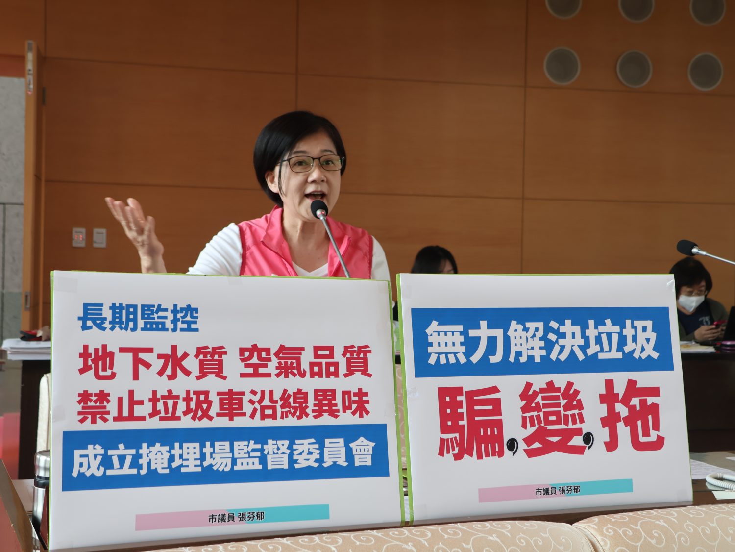 張芬郁表示,台中垃圾處理能力不足,已經影響社區清潔費漲價和事業廢棄物偷倒事件頻傳,大里旱溪舊河道和霧峰朝陽大學後山山路,都發現建築裝潢廢棄物,根據《廢棄物清理法》及《建築物拆除施工管理辦法》,拆除的廢棄物必須納管,才能取得開工許可與使用執照,小規模的居家裝修也應委託合法清除公司處理,但環保局未掌握廢棄物流向,疏於為台中市環境把關。