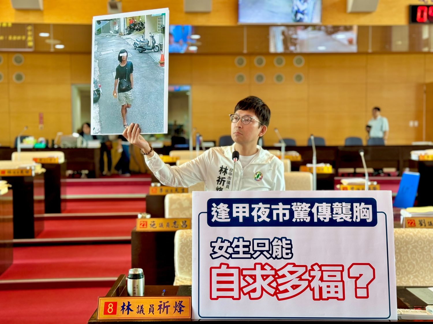 【記者蘇詩鋒/台中報導】台中市逢甲夜市周邊上週驚傳隨機襲胸案件,引發社會關注。台中市議員林祈烽今日於議會警消環衛業務質詢中指出,一名女性民眾僅於晚間外出至便利商店購物,竟在巷弄內遭陌生男子襲胸,嫌犯隨即逃逸,讓受害者至今仍心有餘悸。林祈烽痛批,台中作為人口密集、觀光熱絡的全國第二大城市,竟讓女性暴露於如此高風險生活,市府顯然在治安維護與犯罪防治上出現漏洞。