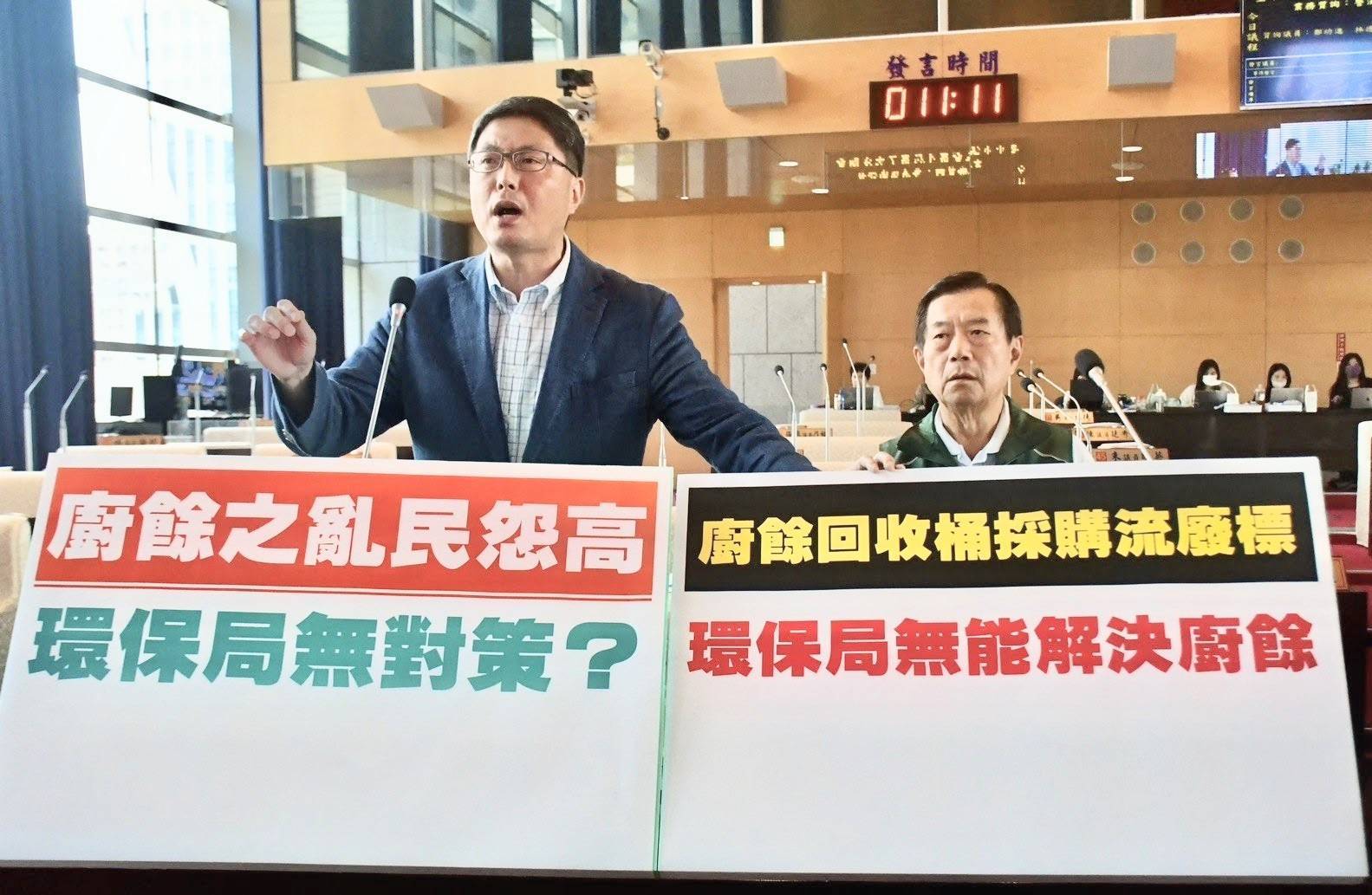 【記者蘇詩鋒/台中報導】針對台中市廚餘大亂凸顯環保局管理失能,市議員林德宇、鄭功進今(4/28)在議會警消衛環業務質詢時表示,上週北屯區清潔隊發生沿街沿路倒廚餘廢液,事過一周環保局仍無作為,只以個案懲處,卻沒提出可預防垃圾車廢液過滿無處倒的配套及解決方案,甚至連清潔隊工作用的廚餘回收桶歷經3次流廢標無法順利發包,讓第一線清潔隊員無器具可處理廚餘,他直指環保局無心且無能處理廚餘,只會講大話,痛批「大事做不了,小事做不好」。