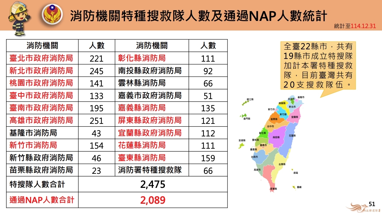 施志昌在質詢中引述消防署最新數據指出,截至114年底,台中市特種搜救隊人數僅133人,在六都橫向對比中位居末座。儘管台中特搜隊是中部唯一通過國家搜救能力分級檢測(NAP)「重型級」認證的隊伍,具備國際級技術水準,但現有人力已面臨極大挑戰。