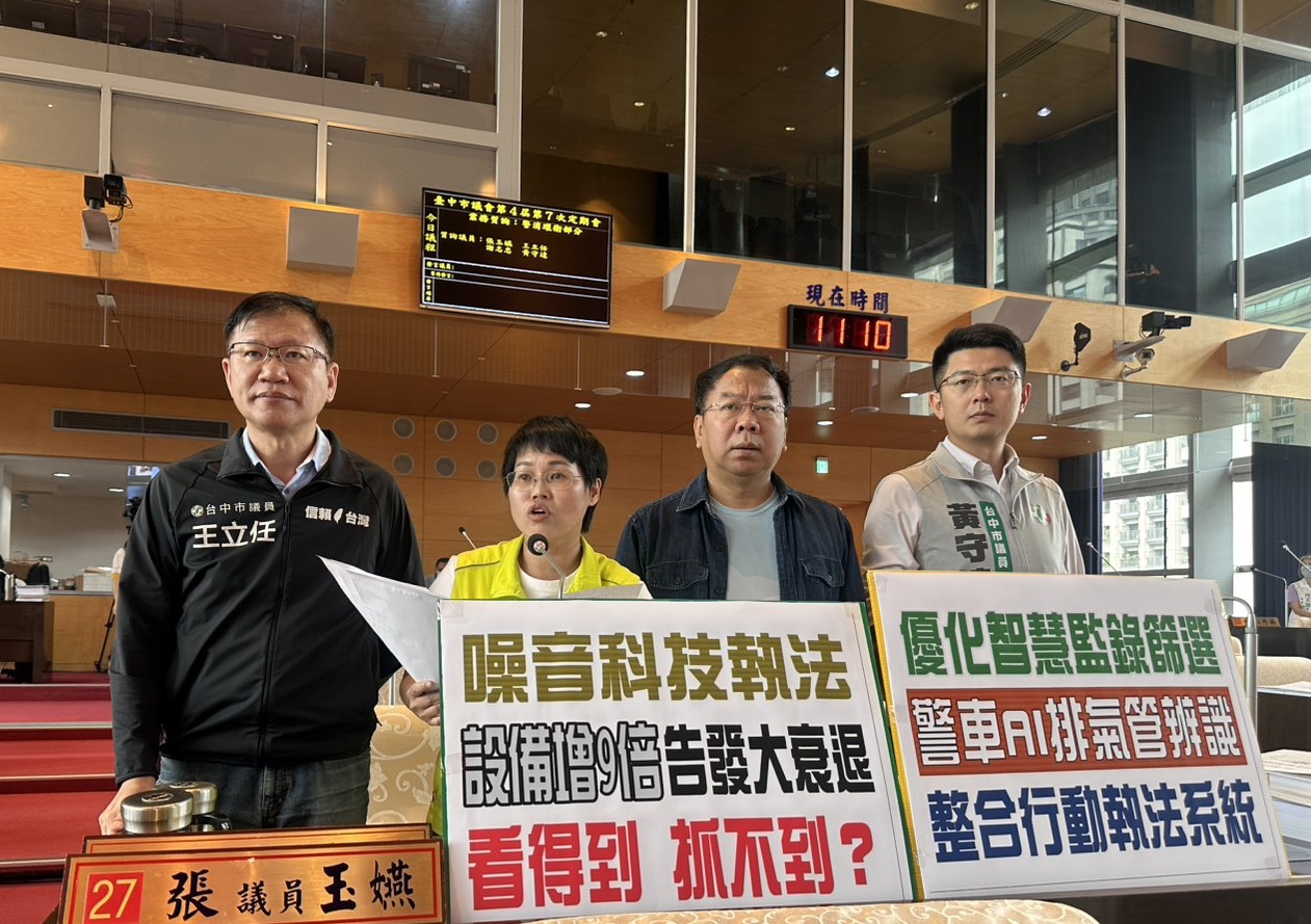 【記者蘇詩鋒/台中報導】市府這3年大幅添購噪音車科技執法設備,議員張玉嬿、謝志忠、王立任、黃守達卻發現設備增加9倍,告發率竟衰退3倍,今日在議會質疑噪音治理已陷入「看得到、抓不到」的困境,噪音車依舊頻繁擾民,要求市府升級「行動AI辨識」以補強執法漏洞。