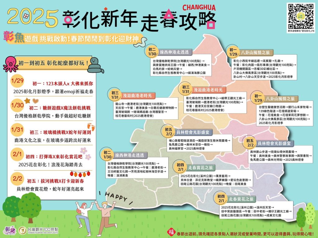 2025年新春,彰化縣政府邀請民眾走春天天來彰化,來彰化挑戰「彰魚遊戲」,體驗別具創意的走春活動,讓新的一年「蛇」麼都好玩,幸福滿滿!請持續關注愛玩彰化臉書粉絲專頁及彰化旅遊資訊網https://tourism.chcg.gov.tw/ ,隨時掌握最新旅遊動態與活動資訊!