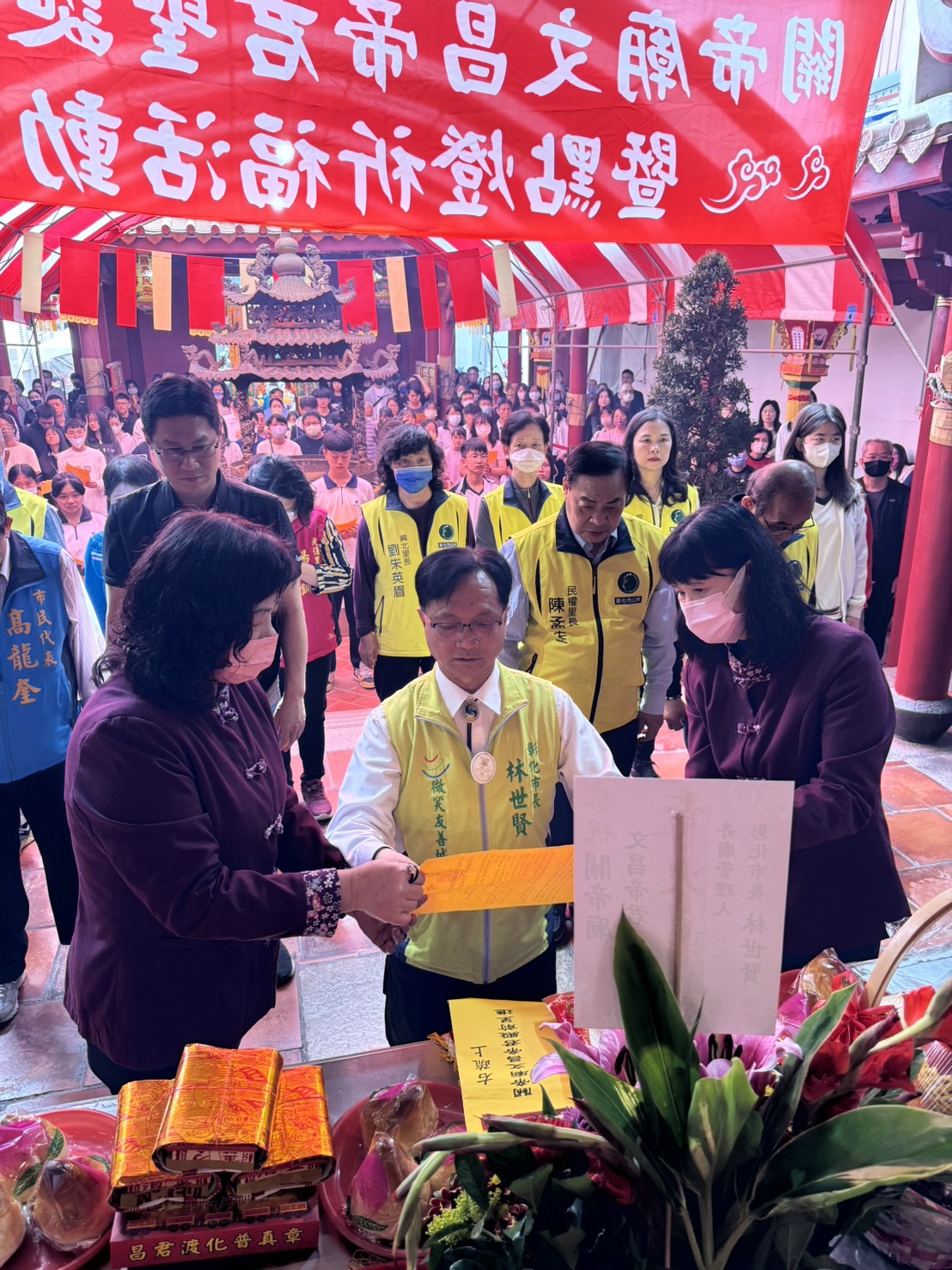 廟方今年特別邀請彰化市籍、從小就是文昌帝君信眾,目前任職於內政部的陳政文,到場現身說法,分享他的讀書心得及如何應考等秘訣,他分別在109年考取普考、113年更高中高等考試三級榜首!林世賢市長以陳政文為例,期許所有的考生在文昌帝君的庇佑下,增進信心與考運,應試時發揮 實力,順利高中金榜。