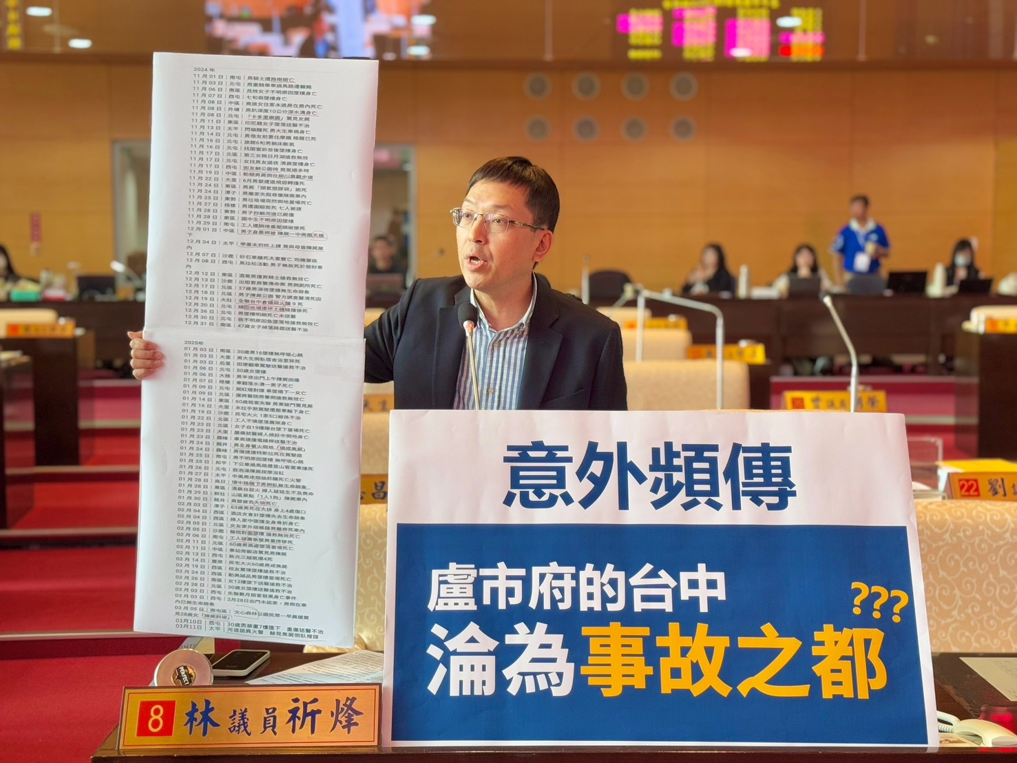 【記者蘇詩鋒台中報導】台中市長盧秀燕,日前曾大吐苦水指控,台中市有3項重大建設「中央一毛錢都沒給」,但面對藍白兩黨大幅刪、凍總預算,卻隻字不提。台中市議會今12日第五次臨時會專案報告,市議員林祈烽質疑,重大建設會要錢,基礎民生卻不顧。短短不到半年,人禍死亡人數近百人,就算爭取再多建設,也沒人敢來台中,讓台中市淪為事故之都,許多市民感到不可思議,直呼市府民調高,角逐總統大位,台中的螺絲就鬆了。 林祈烽憂心,他的選區西屯區這兩個月來真的非常不平靜,2月13日新光三越發生重大氣爆事故、3月8日高醫大大四生遭無照酒駕男子撞倒傷重不治,甚至前日,也有30歲男性自7樓墜樓身亡。最近在社群網站上有一份台中市近期意外事故身亡案件的統計資料,指出光是去年11月至12月,兩個月就有46人意外身故。而今年1月有26人、2月則有17人,截至3月中旬,也有高達48人意外死亡,這樣的事故數,市長難道要繼續裝聾作啞嗎? 林祈烽指出,這些事故發生的原因,五花八門,其中不少意外,市府也責無旁貸,不論是遭無辜市民遭路樹砸亡、街友躺在公園長椅上氣絕多時,還是趴在市區的深水溝中身亡、勒頸男屍倒在柳川步道、仰躺河道的屍僵大體、男子身裹棉被,陳屍於一中商圈天橋,上述事件無一不是市府的維護管理不當,就是台中市現有的社會安全網出現破口。 林祈烽呼籲,面對人禍不斷,相關局處應提出積極的防制作為。盧市長更應主動召集警察局、社會局、衛生局、消防局等,組成跨局處的專案小組,來保障市民生命安全及避免鄉親持續恐慌。