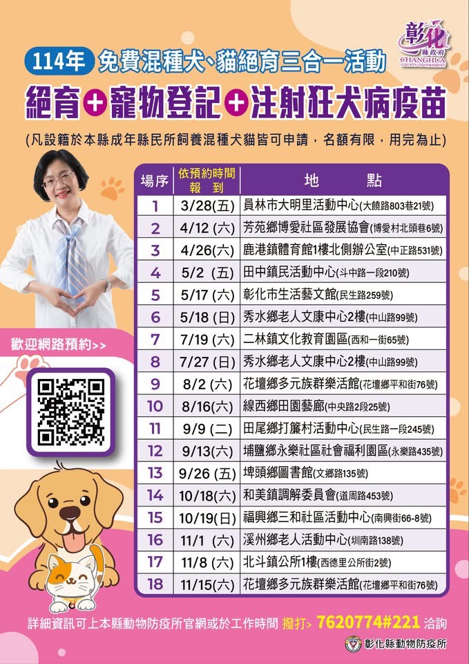 本活動共規劃 18場次,已於3月28日員林市舉行第一場,為 129隻混種犬貓完成絕育,活動獲得民眾熱烈響應與參與。