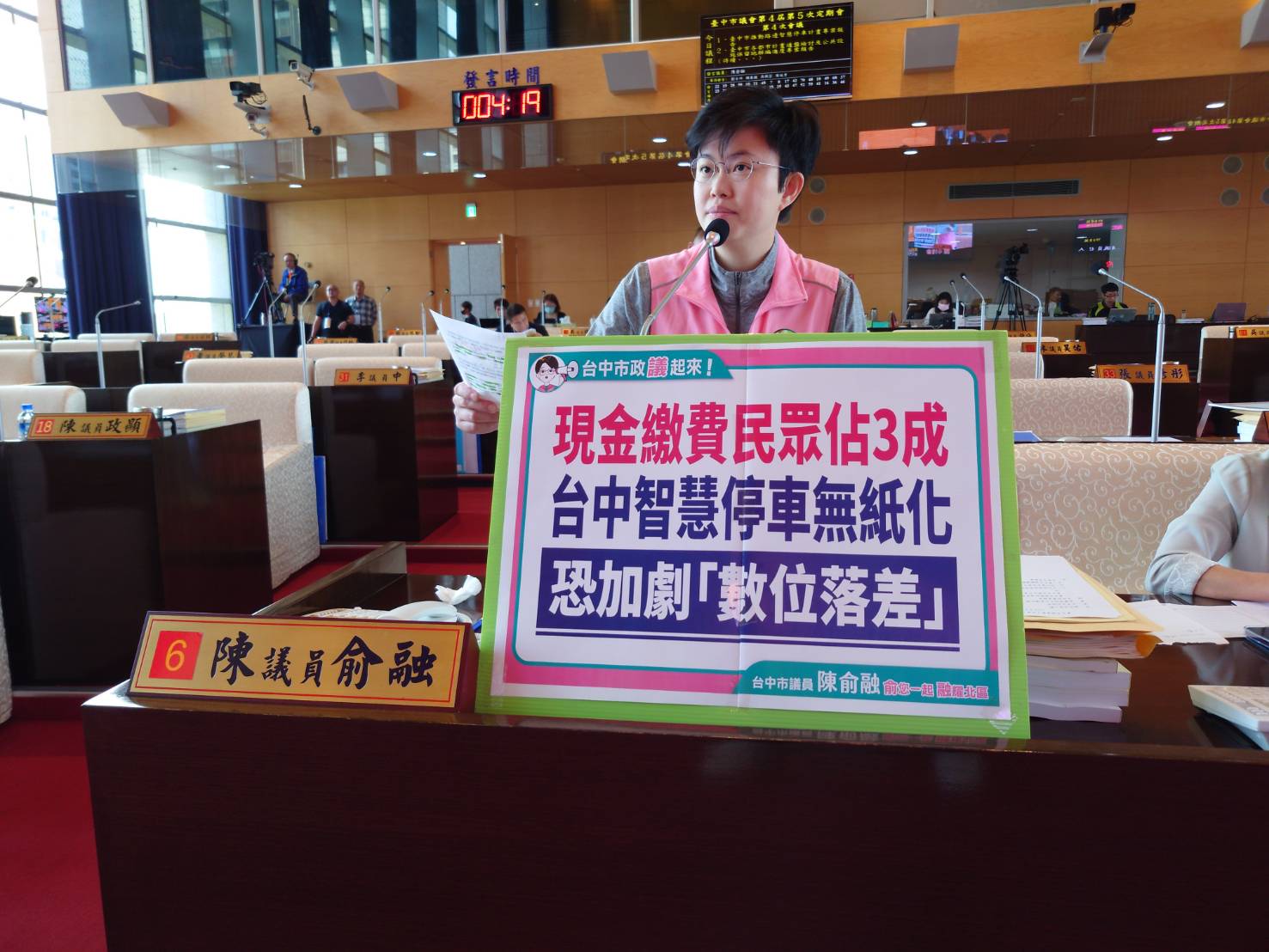 【記者蘇詩鋒台中報導】今日台中市議會舉行智慧停車計畫進行專案報告。市議員陳俞融質詢中表示,智慧停車立意良善,但執行上路後,市民是否真能感受到便利?還是只是讓政府多了施政噱頭,讓市民多了困擾?若市府未落實宣導及配套措施,恐讓部分市民陷入「數位落差」。