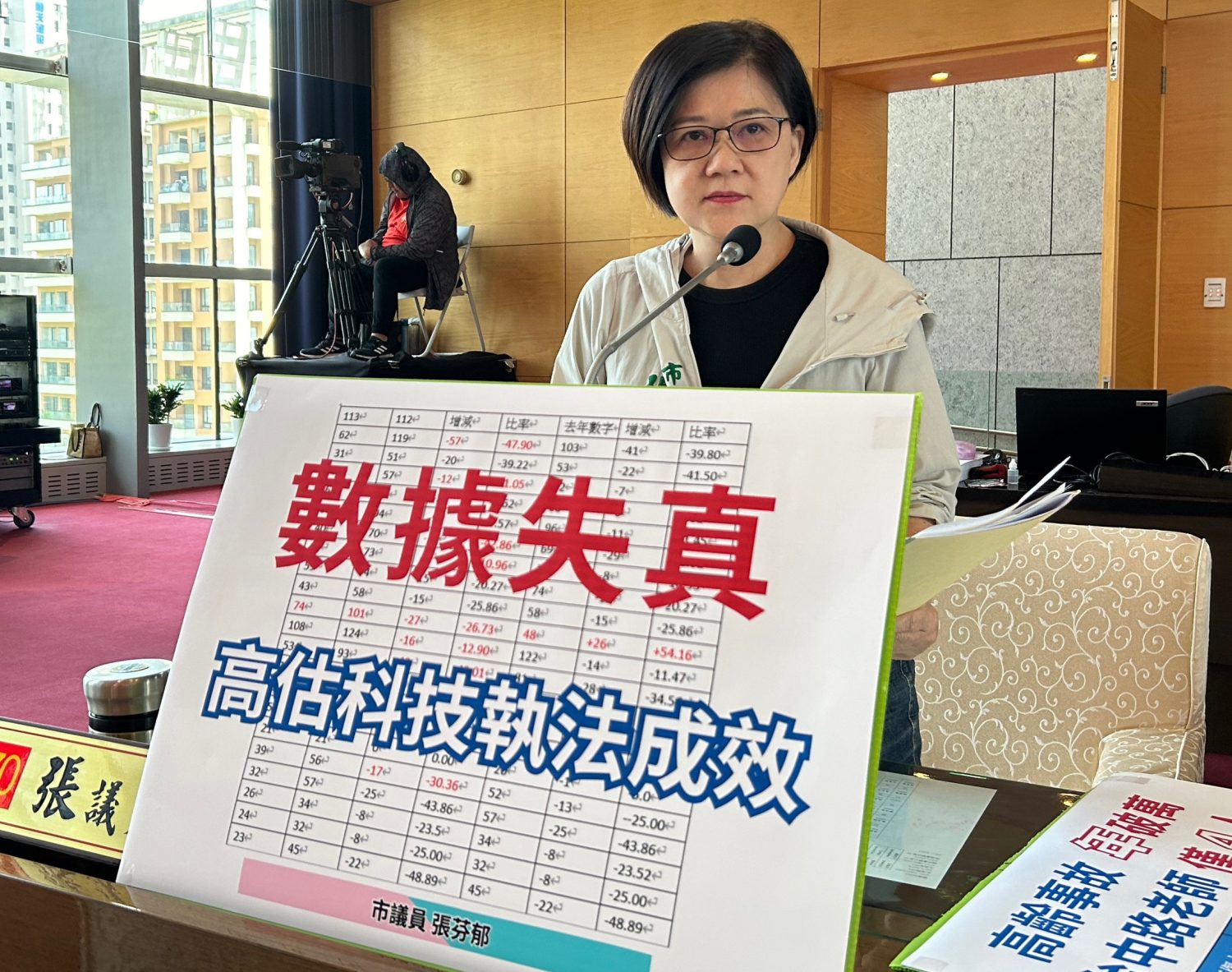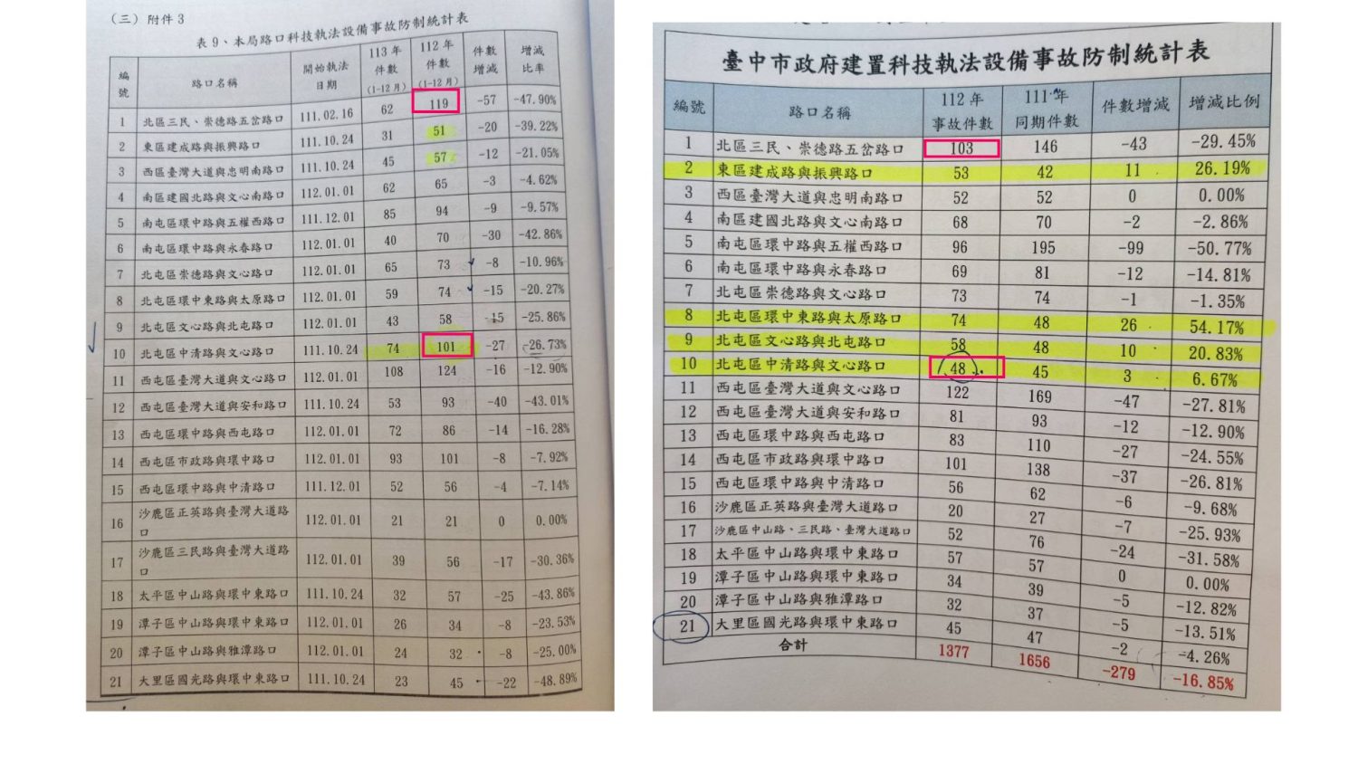 張芬郁也指出,警察局以科技執法做為降低交通事故的良方,去年裝設21處,今年已增加為68處,吹擂科技執法的成效,但數據錯誤失真,以中清路和文心路口為例,去年專案報告提出112年的事故件數是48件,但今年的專案報告變成101件,113年該路口發生74件事故,誇稱因為科技執法有成減少27件,但若以去年的數據實際是增加26件。
