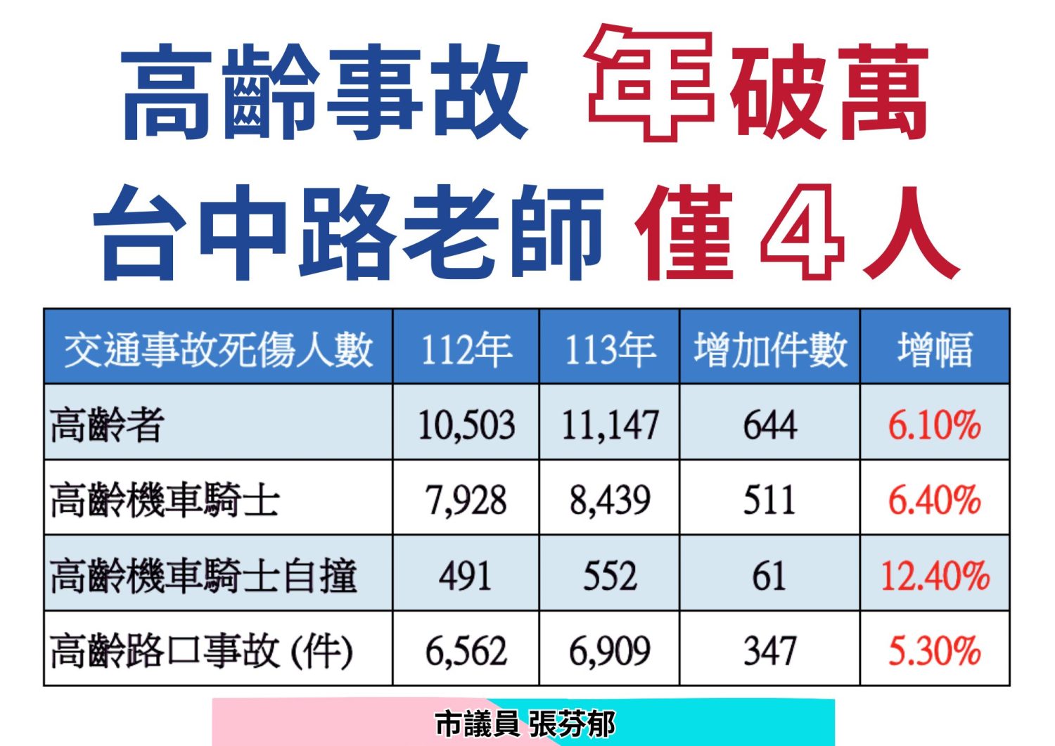 張芬郁表示,根據交通部道路交通安全網資料,台中市113年65歲以上高齡者交通事故死傷人數1萬1147人,較112年同期增加644人,增幅6.1%;其中,高齡者機車事故死傷8439人,增幅6.4%;高齡者機車自撞491人,增幅12.4%;高齡路口事故6562件,增幅5.3%。