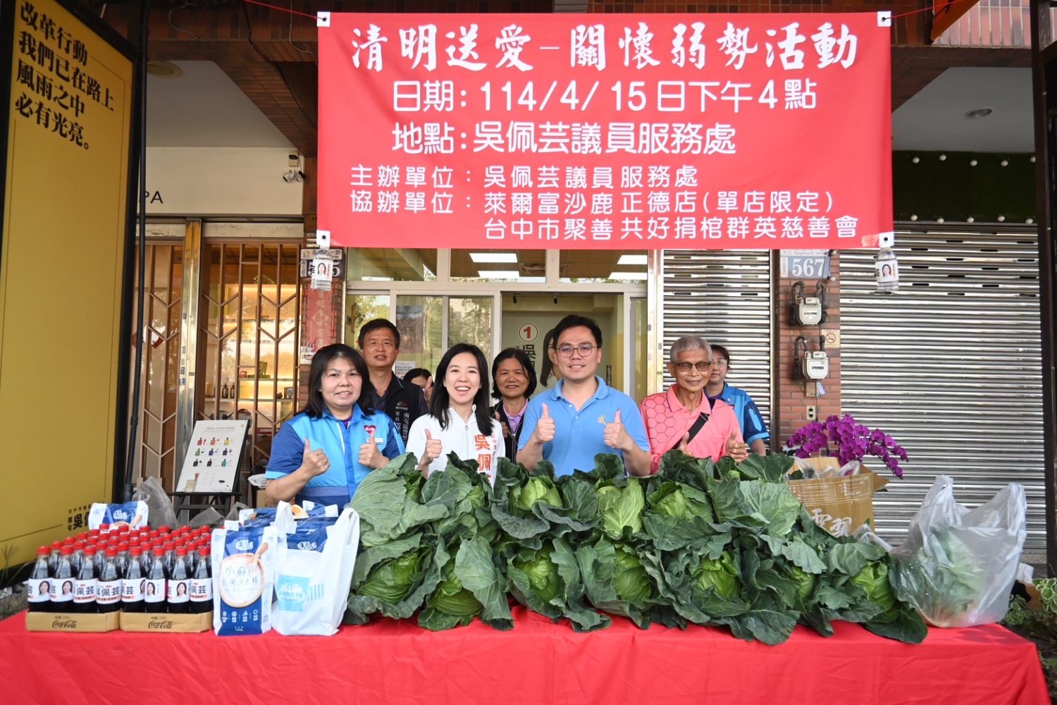 【記者蘇詩鋒/台中報導】近日高麗菜盛產價格直直落,臺中市議員吳佩芸不忍農民辛勞付之一炬,15日下午在台中市聚善共好捐棺群英慈善會及萊爾富國際股份有限公司中部營運處、萊爾富沙鹿正德店支持下,與豐樂里辦公處及鎮平里辦公處合辦「愛心高麗菜免費送」活動,同時當天感謝南屯區區長林秋萬蒞臨現場,一同與南屯區市民分享高品質高麗菜。