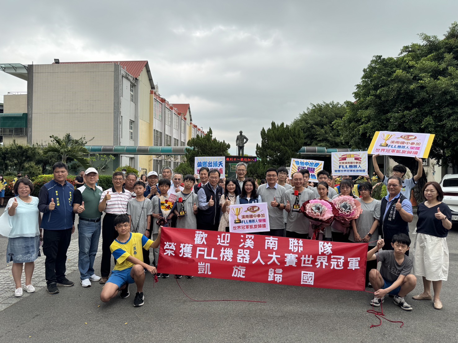 現場也有教育局副局長郭明洲、溪南工商協進會理事長吳銘禧與烏日林姓宗親會理事長林樹浚等人到校,稱讚同學的努力以及老師辛苦的教導,在這次的世界比賽當中表現傑出。 溪南國中校長張祥宜表示,這群孩子學業表現可能不出色,但在學校提供機器人、程式設計、AI、電子、物聯網及3D遊戲藝術設計等社團技能培訓下,找到了自信與未來方向。