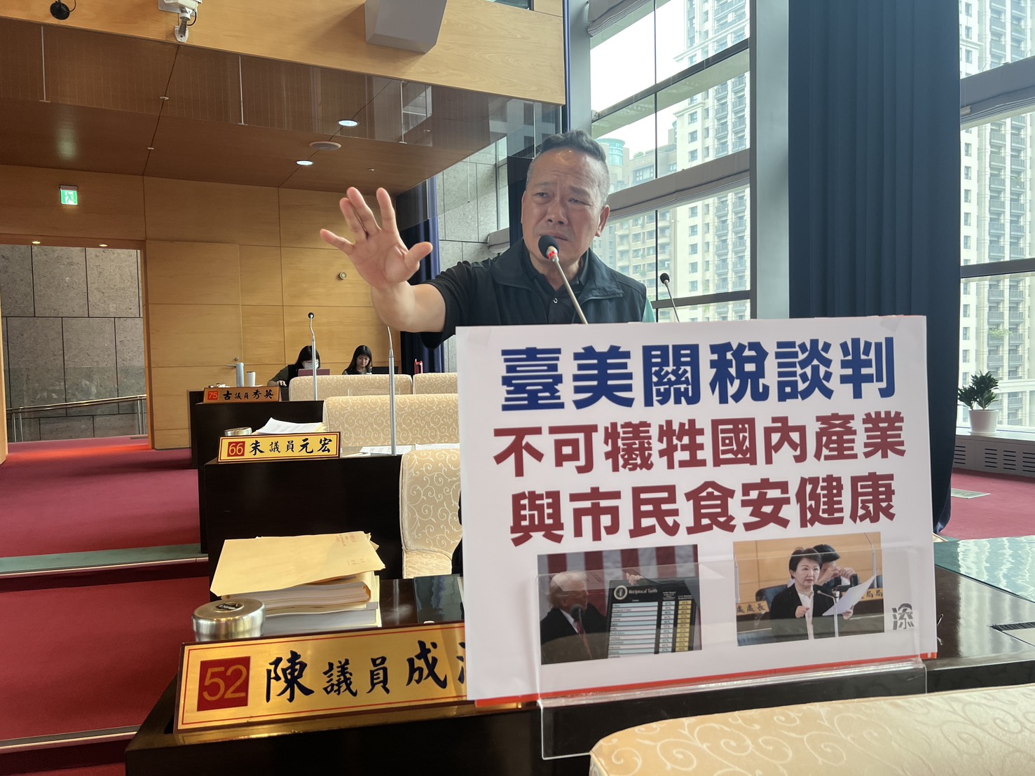 陳成添建議,臺中市過去曾修訂自治條例積極防堵萊豬流入學校的營養午餐內,此次市府也應堅決反對美國豬肉不標示產地的要求,避免大量隱形萊豬流入,危害市民食安;此外也應堅決反對美國農產品零關稅,避免衝擊臺中市的稻米、蘭花、地瓜、豬肉及其相關加工食品,造成嚴重損失。