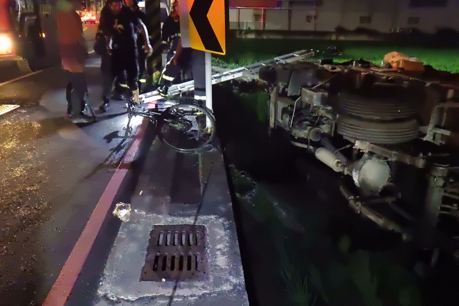 【記者黃金龍/台中報導】吳姓男子深夜駕自小貨車行經台中市潭子區一處轉彎產業道路,因偏離車道撞擊前方騎鐵馬的黃姓男子後,車輛翻覆稻田中,黃男送醫急救後宣告不治,全案將吳男依法送辦。