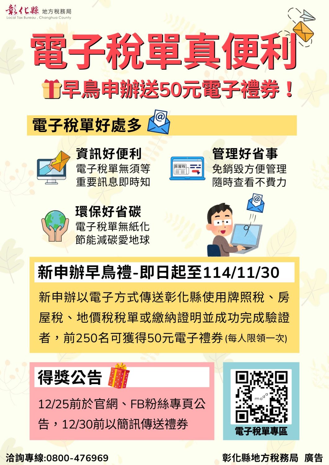 【記者吳晟明/彰化報導】為響應政府e化環保、節能減碳政策,彰化縣地方稅務局舉辦「電子稅單新申辦送好禮」活動,即日起至114年11月30日止,只要新申辦以電子方式傳送本縣稅單或繳納證明並成功完成驗證者,就有機會獲得電子禮券,歡迎民眾踴躍參加。