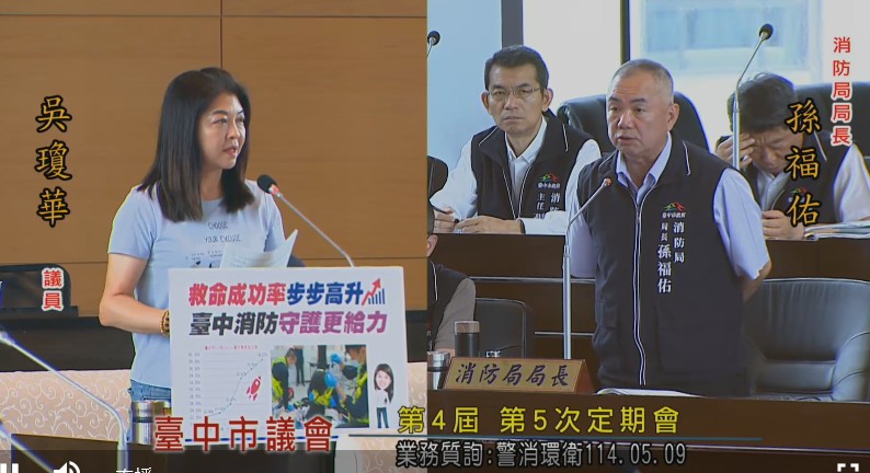 【記者蘇詩鋒台中報導】臺中市議員吳瓊華今(9)日在市議會業務質詢中指出,根據統計資料,臺中市到院前急救成功率連年提升,113年更達到38.22%,高居六都第二,顯示本市緊急救護體系運作良好,成效顯著,應給予消防人員肯定與鼓勵。