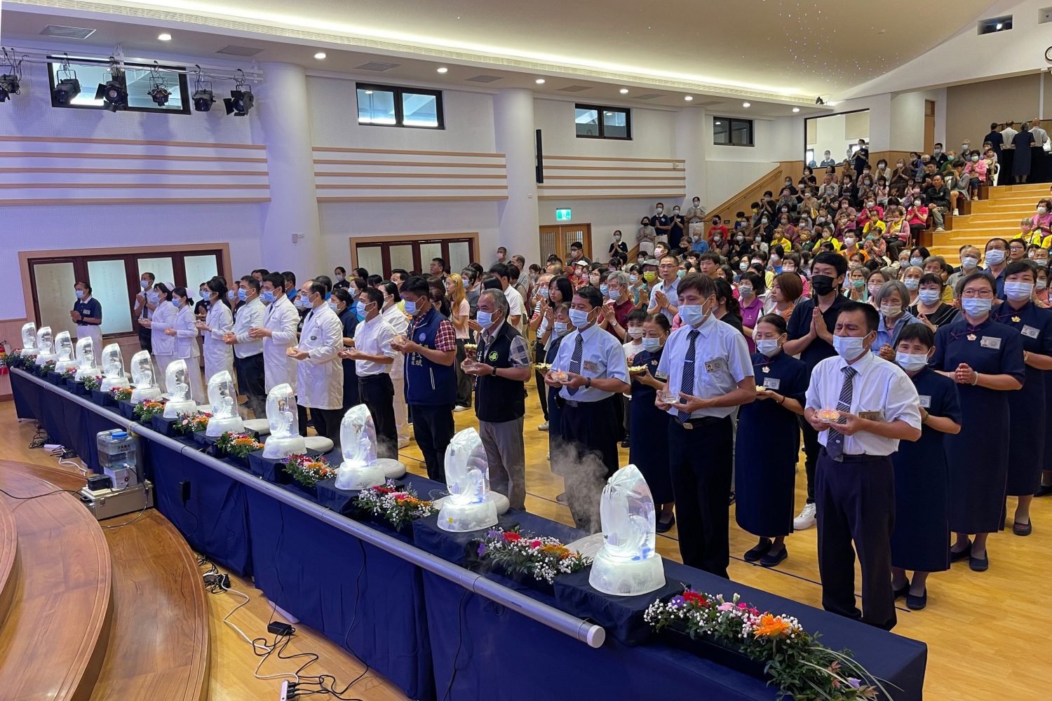今年浴佛典禮別具特色,首度在醫院大廳外布置象徵佛陀弘法場景的靈鷲山說法臺,典禮過程並特別融入《無量義經》梵唄唱誦,讓大眾身歷其境貼近佛心更能體會佛法真義。伴隨細雨,會場宛如法水灑淨,佛號聲與梵唄旋律引領眾人沉澱身心,醫院頓時化作寧靜莊嚴的法會現場。