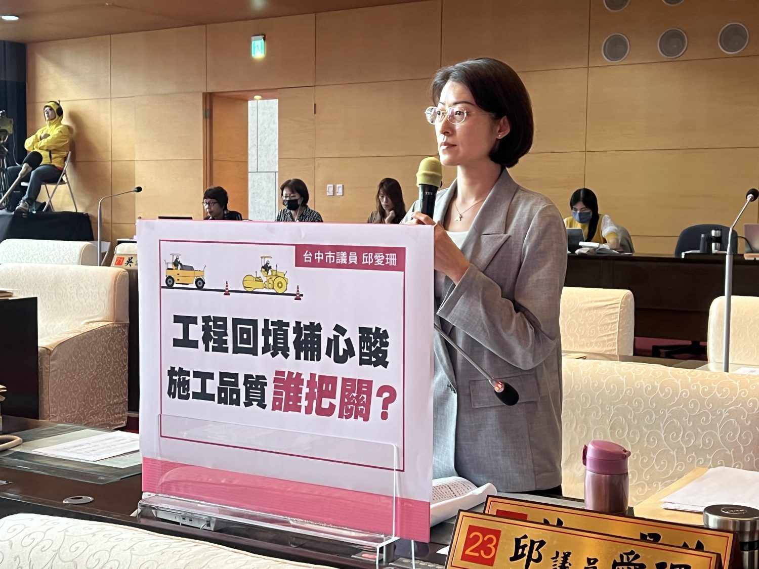 邱愛珊要求建設局應公開說明截至目前查核與裁罰次數,並檢討《臺中市道路挖掘管理自治條例》第25條,建議針對道路挖掘工程,尤其是重大工程,應該修正為「應」加強派員抽查,強化稽查強制性。