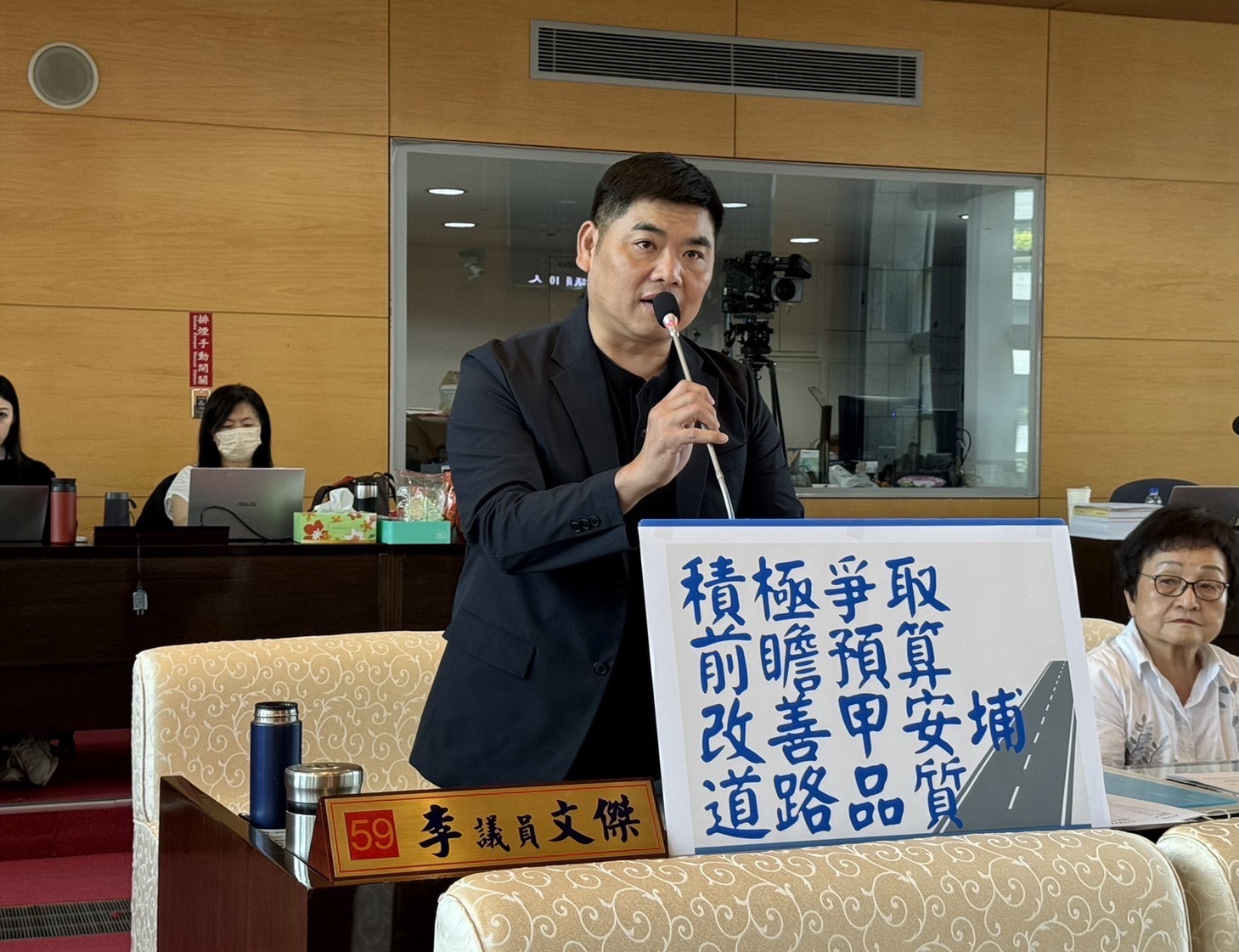 【記者蘇詩鋒台中報導】台中市議會定期大會都發建設水利業務質詢,市議員李文傑關切甲埔大道最新工程進度及甲安埔地區道路品質改善情形。