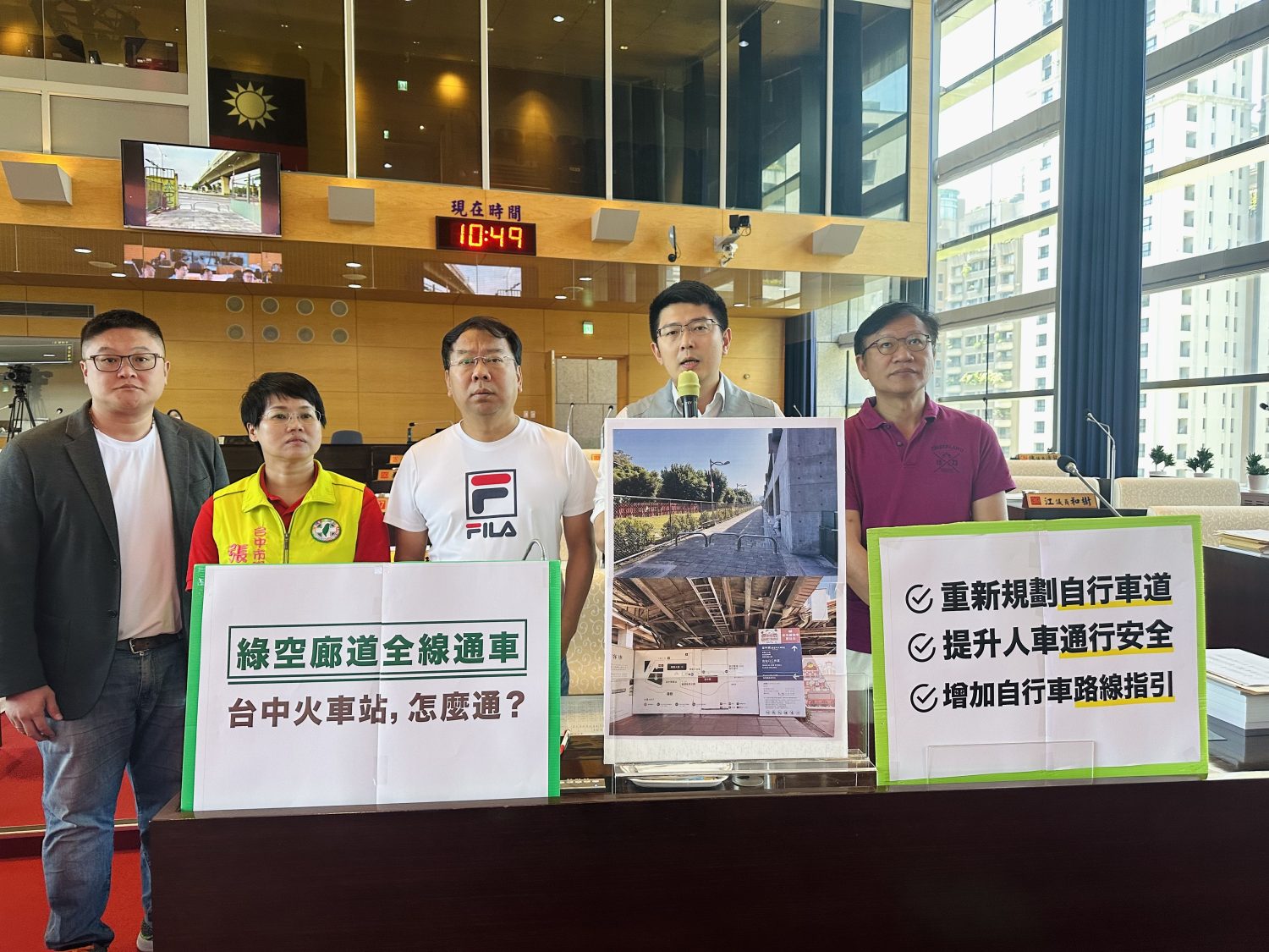 黃守達、謝志忠、張玉嬿、王立任共同要求,火車周遭的自行車道應該重新規劃,整個綠空廊道也須優化,提升人車通行安全,並增加自行車路線指引,讓綠空廊道的自行車騎乘體驗可以真正暢行無阻。